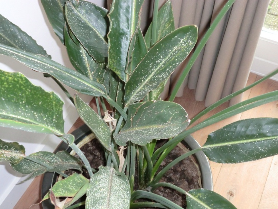 Een half jaartje geleden heb ik een Strelitzia Reginae gekocht. Tijdens de koop zaten er verschillende bloemen in maar die waren binnen de kortste keren uitgebloeid. Vervolgens zie ik niets van bloei terugkomen en lijkt het erop of ie het loodje gaat leggen. De bladeren zitten namelijk onder de witte puntjes. Mijn vorige Strelitzia heeft op dezelfde manier het loodje gelegd. Wat doe ik fout en is de plant nog te redden?