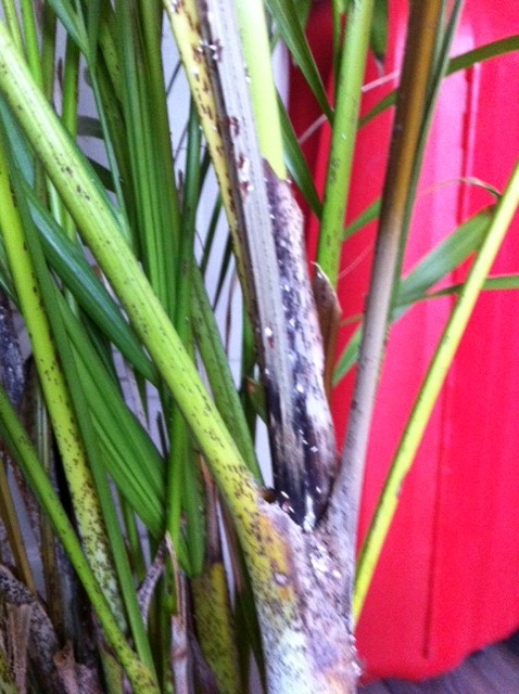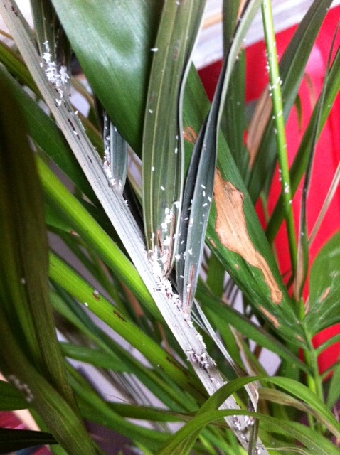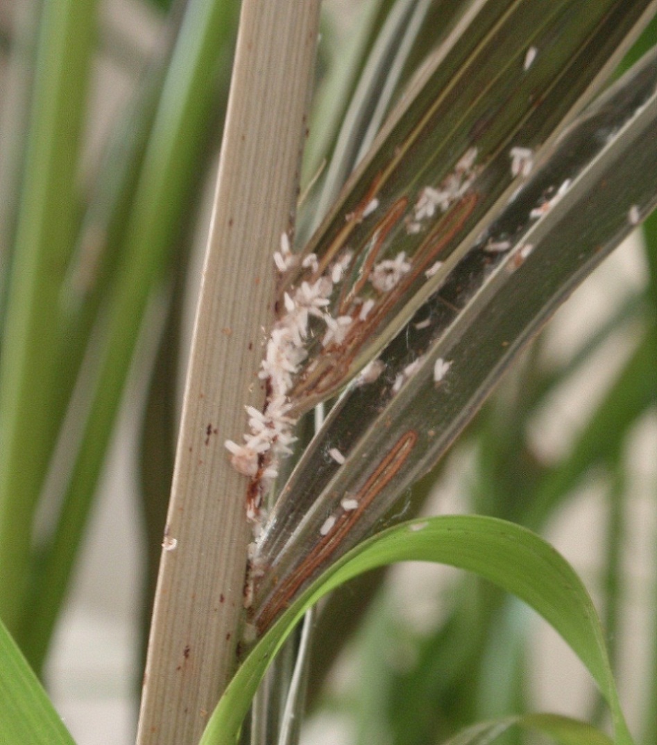 Wij hebben een jaar geleden een palm gekregen welke momenteel erg aan het verdrogen is en vol met allemaal witte langwerpige stipjes zit. Inmiddels heb ik er al een paar verdroogde takken vanaf geknipt en de palm nu ook maar in een koeler gedeelte in huis gezet.