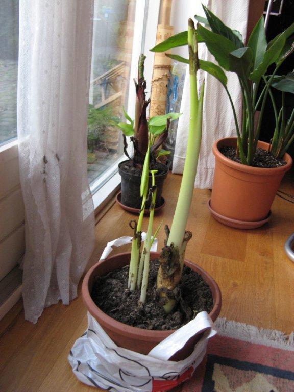 Een maand geleden mijn Zantedeschia "Green Goddes" na uitgraven achter mijn buro gezet om te drogen. Vandaag eens even kijken; tot mijn schrik zag ik dit; hij loopt al helemaal uit; veel te vroeg dus. Iemand een idee mbt hoe nu verder?