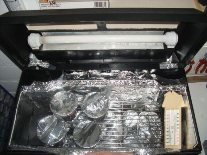 Een ander idee is om een houten bakje in elkaar te schroeven met een afneembaar deksel waarin een fitting van een gloeilamp is op gemonteerd ( bovenkant ). Je plaatst een thermometer vanbinnen, en je isoleert het bakje vanbinnen met zelfklevend zilverpapier.je kan nu je potjes hierin plaatsen.