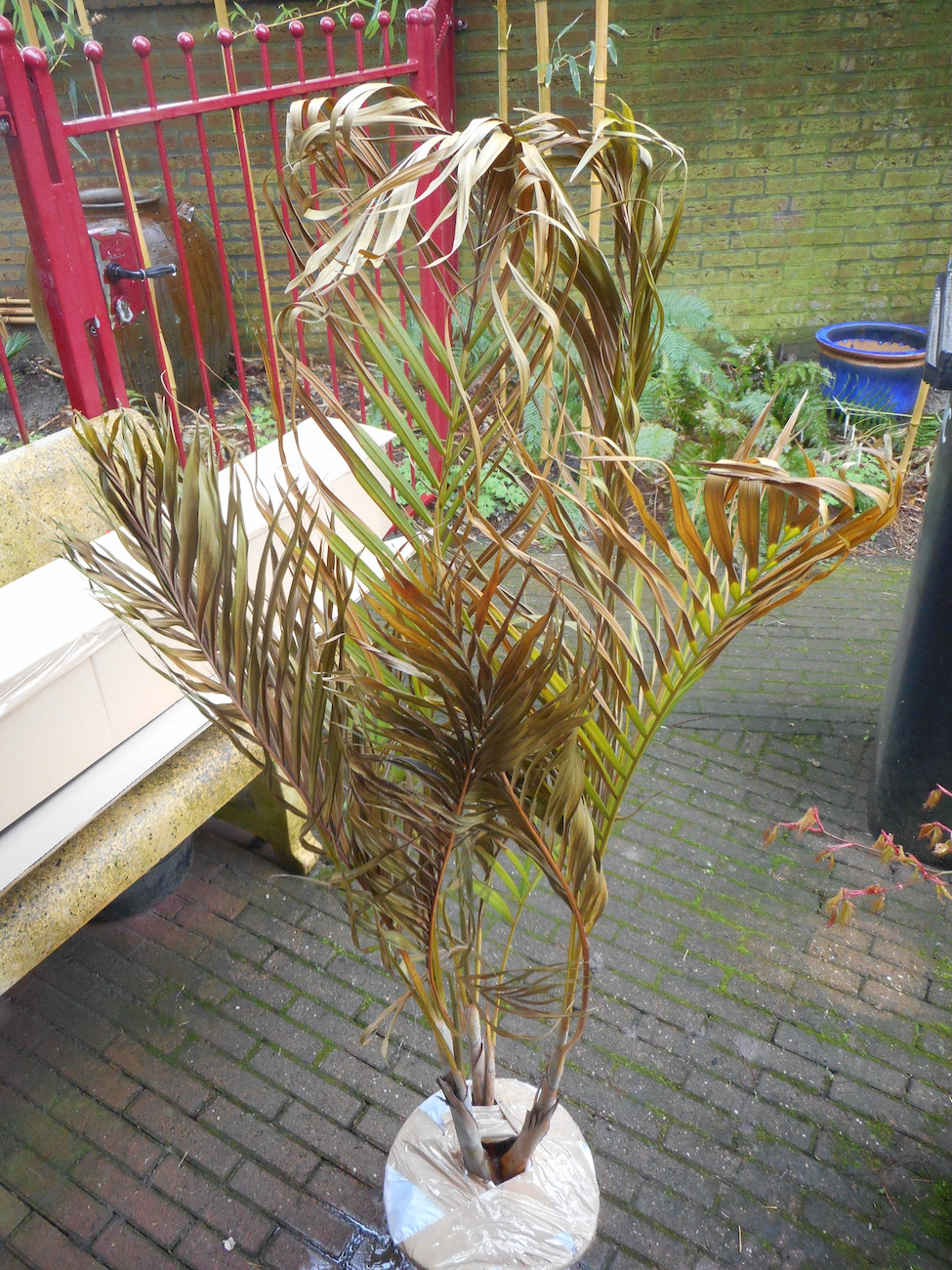 Gisteren arriveerde na 2 maanden onverwacht een verloren gewaand pakket uit Spanje. De verkoper had ondertussen een vervangende palm gestuurd. Of dit uitgedroogde exemplaar nog opknapt is afwachten. Na verwijdering van het verdroogde blad staat het (groene) overblijfsel nu in de woonkamer uit zicht.