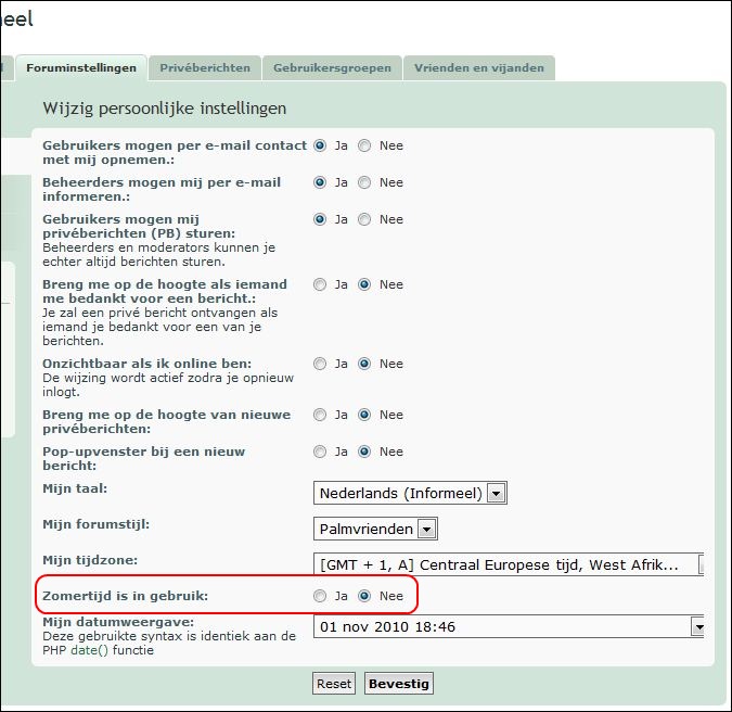 Dit doe je door bovenaan op Gebruikerspaneel te klikken, vervolgens op Foruminstellingen en dan de optie Zomertijd is in gebruik even op Nee te zetten, en onderaan op Bevestig te klikken.