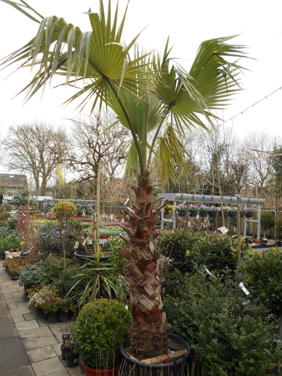 Die Washingtonia is rijp voor de vuilcontainer ik snap niet dat je als tuincentrum zo'n plant nog laat staan..