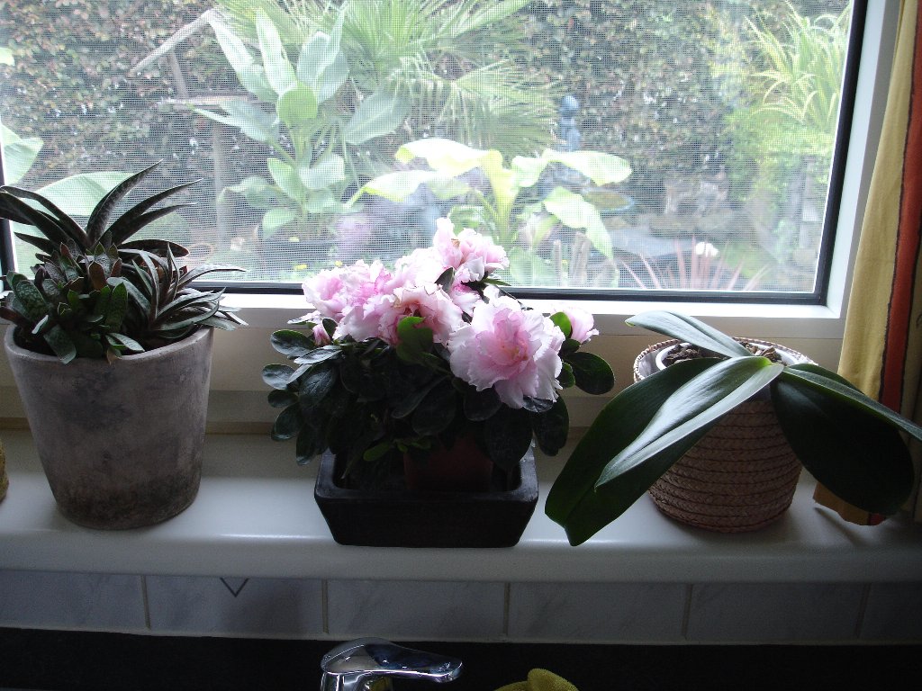 Ik heb een 20-tal phalaenopsissen, 2 venusschoentjes, 6-tal verschillende Cymbidiums, 5 verschillende Dendrobium nobile, 4 verschillende Aechmea's ( 'Clara', 'Inca' ,'Mandy' en A. fasceata ), Dendrobium phalaenopsis, 4-tal verschillende Stapelia's, levende steentjes, Ceropegia woodii, graslelie, beaucarnea ( halfgrote plant ) en ficus pumila. De cymbidiums en Dendrobiums nobile staan nu nog buiten maar gaan in de herfst weer naar binnen.
