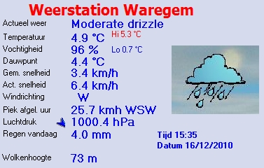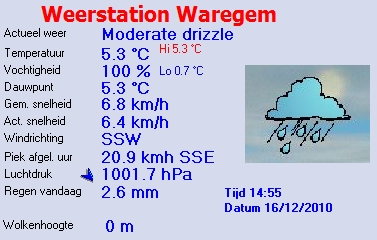 Hier nog steeds geen sneeuw (mooi zo) maar het is wel al de hele dag aan het druppelen, de temperaturen zijn licht positief dus vooralsnog geen gevaarlijke toestanden op de baan. In Wallonië wordt veel sneeuw verwacht deze namiddag dus hopen dat dat niet onze richting uitkomt...