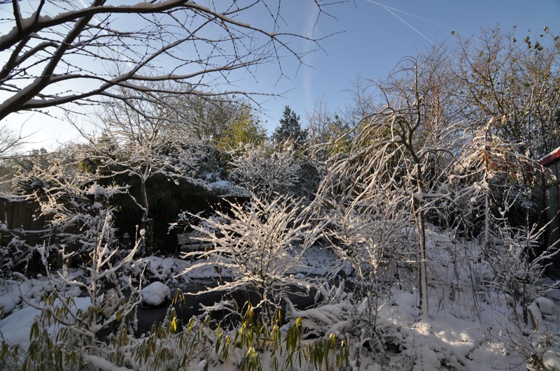 Afgelopen nacht daalde de temperatuur hier tot -9°C en momenteel om 13.30 vriest 't nog licht (-2,5°C). Alle kuipplanten stonden vannacht binnen, in de kas daalde de temperatuur tot 0,9°C gemeten op 1,5 m hoogte. Door 't windstille weer en de sneeuwlaag op 't dak was 1 kW electrische verwarming net genoeg om de kas van 120 m3 vorstvrij te houden. De weinige exoten in de tuin zullen niet veel last hebben ondervonden van de vorst, een 5 tal jonge exemplaren Trachycarpus, fortunei en wagnerianus plus een princeps. Ook voor de Yucca 's rostrata en thompsoniana zal dit geen probleem hebben opgeleverd. De princeps had ik afgedekt met een plantenkuip. Bijgaand plaatje geeft een impressie van de tuin vanochtend.