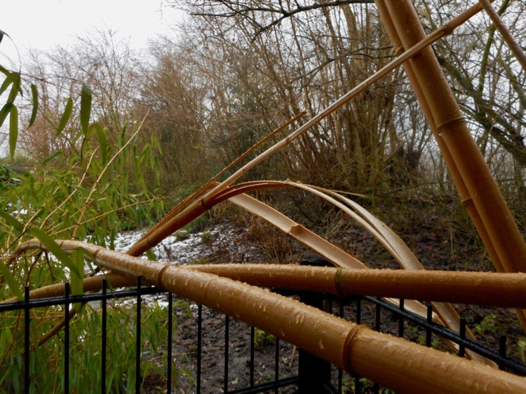 De harde wind in combinatie met natte sneeuw heeft hier gisteren flinke schade bij de bamboe veroorzaakt. De Phyllostachys vivax 'Aureocaulis' was onlangs nog uitgedund en opgeschoond. Die moeite had ik me kunnen besparen. Bekend is overigens de 'zwakte' van deze soort met weliswaar zeer dikke maar tevens dunwandige halmen.