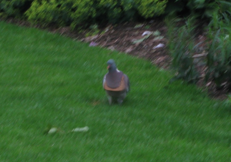 Deze avond kwam er net voor donker een duif op zoek naar brood in onze tuin. Ik weet dat hij op zoek was naar brood, omdat we regelmatig oud brood strooien in de tuin. Tot mijn verbazing zag ik dat er een boterham rond zijn nek hangt.