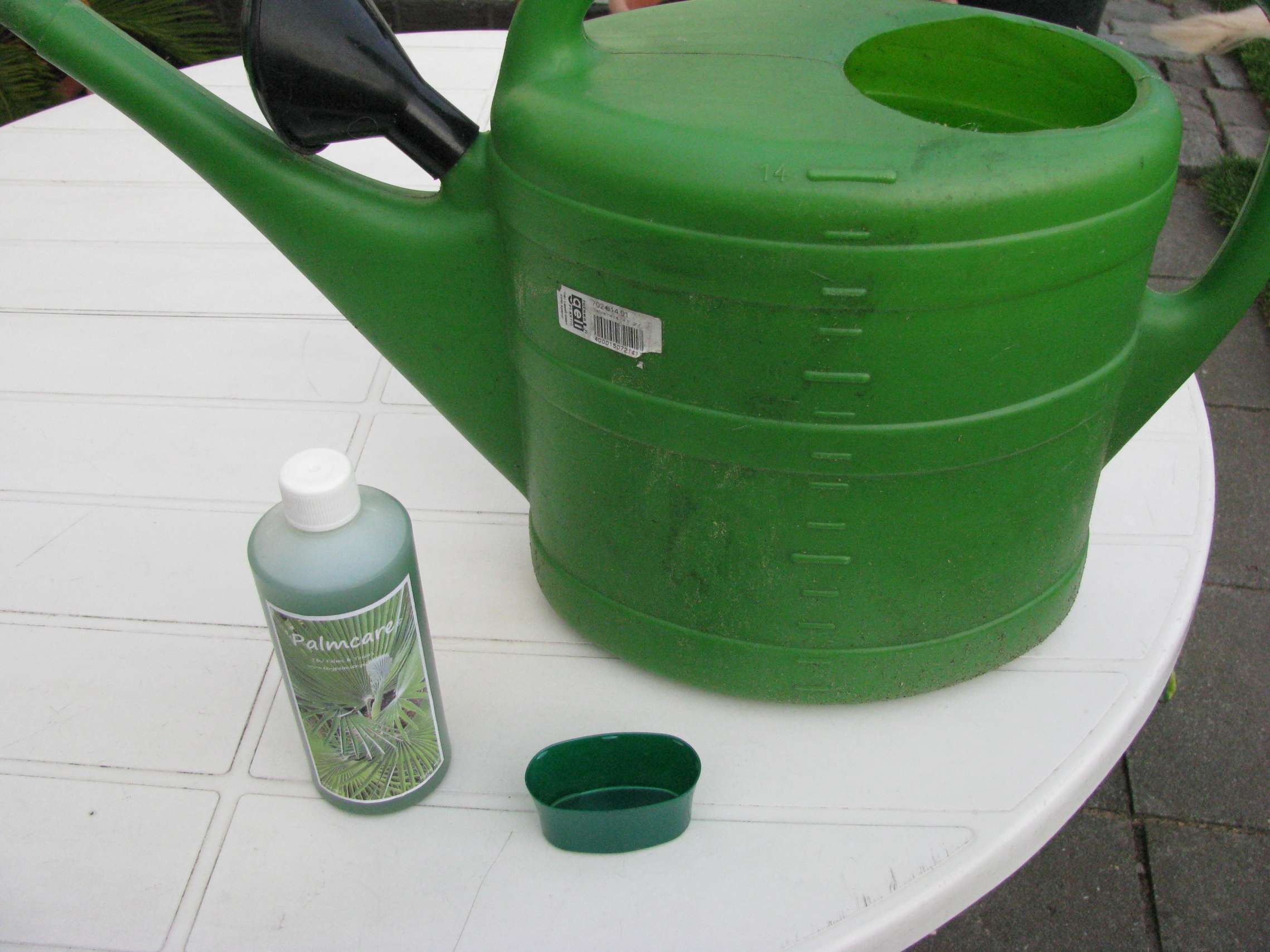 Stap 4: Een gieter vullen met Palmcare (dosis 5ml Palmcare / liter water) en één gieter zonder Palmcare