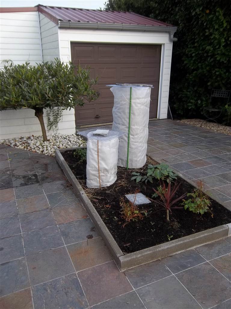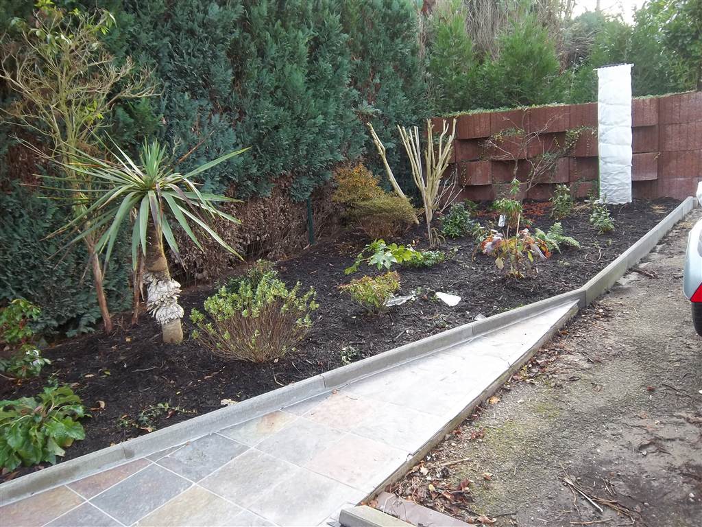 Ik ben momenteel bezig borders uit te steken waar in het voorjaar de winterharde exotische bomen en planten worden aangeplant. De meer gevoelige komen dan in pot op verharde perkjes in het gazon. Ruimte voor de speeltuin van de kleinkinderen moet ik wel behouden.