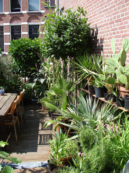 's Winters is het dakterras een flink stuk leger dan op de foto's, omdat daar de koude wind veel meer aanwezig is dan in het beschutte tuintje. Dan staan daar alleen de echt winterharde planten nog. Dit jaar ga ik wel proberen een paar planten op het dak te houden zoals de trachelospermum jasminoides (toscaanse jasmijn), eventueel een beetje ingepakt.