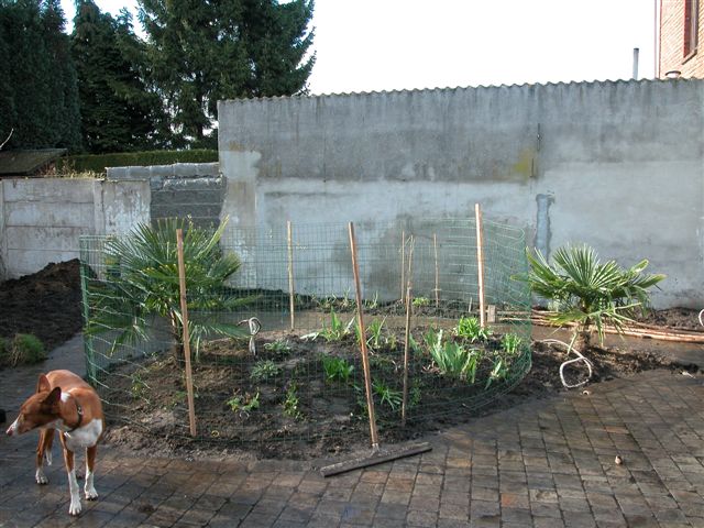 Dat ziet er prima uit hoor! Originele vijvervorm heb je gekozen! De bestrating is ook mooi, benieuwd naar het zicht eens er water in de vijver zal staan! Leuke hondjes ook, die draad rond het palmeneiland is voor hen?