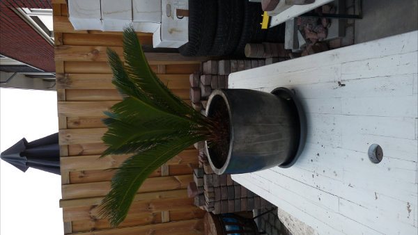 Heb je geen foto van je plant ? Bij een cycas komen de bladeren er tegelijk uit ( in mijn geval 14 stuks, in een andere topic 20 stuks..), en ze zijn inderdaad groen.