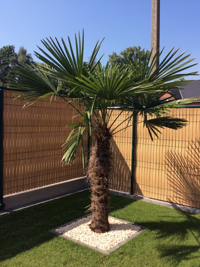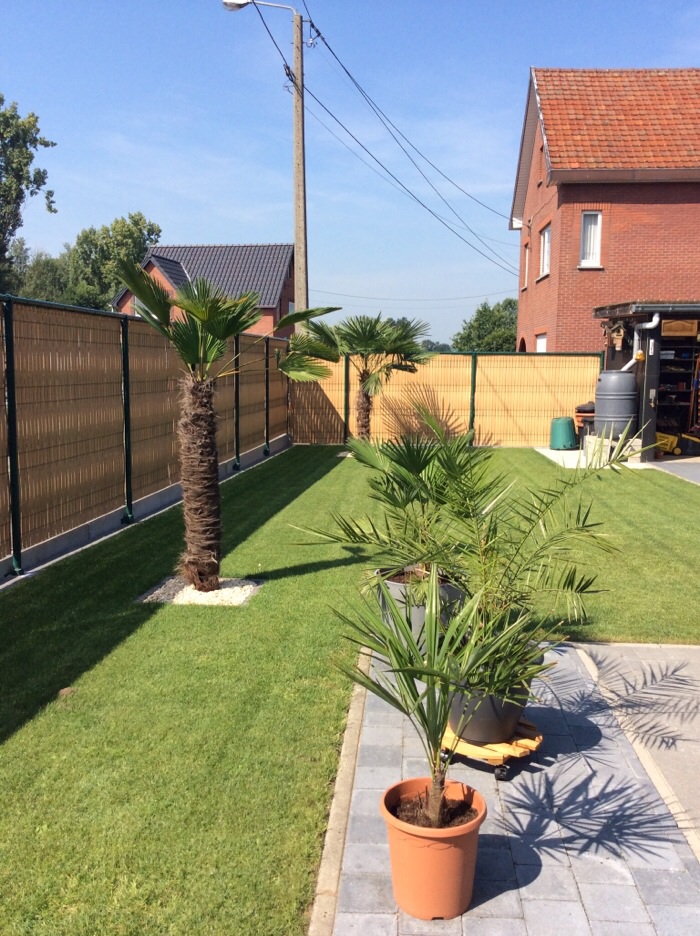 Ondertussen hebben we 2 grote palmbomen ( 1 fortunei en 1 wagnerianus) in onze hof in volle grond staan. Een kleine wagnerianus in pot, net als een fortunei.