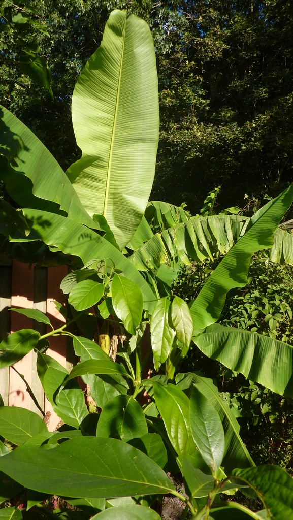 Toen eenmaal de zaden van de Washingtonia afkomstig van Tenerife ontkiemden, ontkiemde bij mij de voorliefde voor een tropische tuin. Sommige planten in de tuin zijn helemaal niet tropisch, maar helpen wel mee de illusie te wekken. Er zijn bv planten die qua blad lijken op een alocasia. Een paar bloeiers als Clematus en fuchsia kleden ook mooi af. Varens kunnen de suggestie van palmen (of cycas) wekken. Een inmiddels enorme druivenplant en blauwe regen kleden de tuin helemaal af. Zeker in het voorjaar is de illusie compleet.