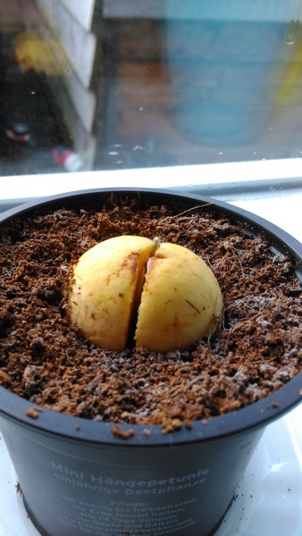 Ik heb er na al die pogingen ook eentje geprobeerd direct in de grond te laten ontkiemen, deze was al gespleten toen hij boven in de kou stond, maar begint nu een klein steeltje te laten zien:
