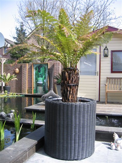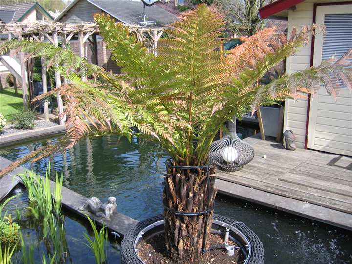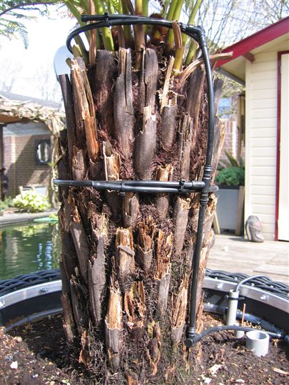 Bij de Dicksonia heb ik een automatisch watergeef systeem aangebracht zoal te zien is op de foto hij krijgt nu 2 keer p/dag een half uur water over de stam.