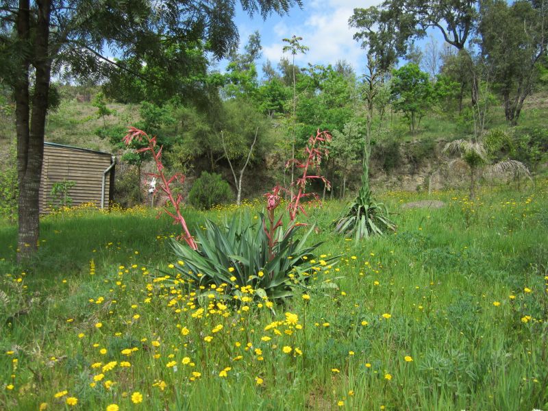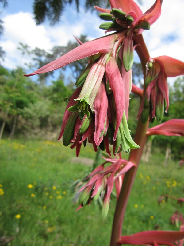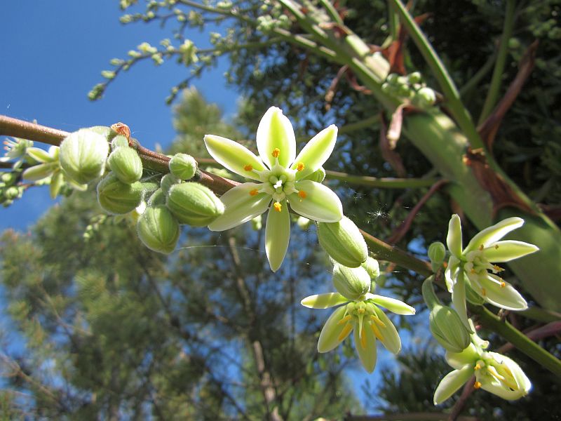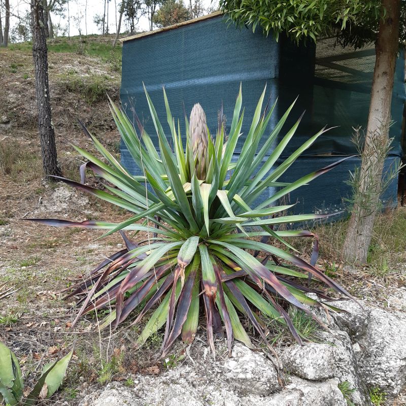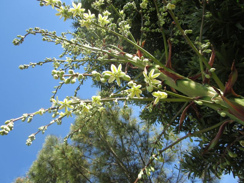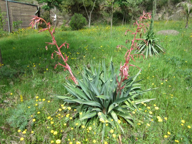 deze plant is bezig om een enorme bloeistengel te maken. Ik vermoed dat het een Fucraea foetida is, maar weet het niet zeker en sta open voor suggesties. Na de bloei zal hij vele broedplantjes aan de bloeistengel maken. Hij is dus makkelijk te vermeerderen. Helaas kan hij slechts lichte vorst hebben...