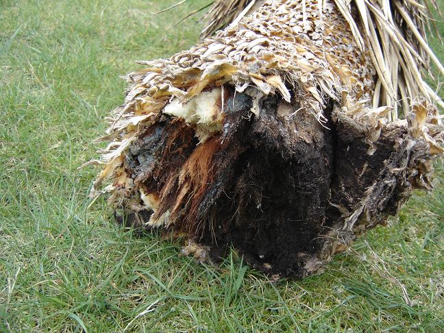 De oorzaak zal vermoedelijk toch vocht zijn. Misschien is die al heel lang aan het rotten maar bij Yucca's merk je dat pas laat. Ik heb het rotte deel er nu geheel afgezaagd (stam is nu gehalveerd) en heb de kop te drogen gelegd. Ga proberen hem dan terug op te potten in de hoop dat er terug wortels komen.