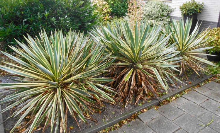 Bij de afgebeelde Yucca met bloeiwijze was de uitgebloeide plant na een jaar vrijwel verdwenen en vervangen door een cluster jonge planten (afbeelding volgt). Yucca gloriosa kan een stam vormen maar de kans daarop is groter wanneer er geen bloei optreedt. Ik probeer dit hier te voorkomen door de gekozen standplaats tussen het groen (foto). Dit geeft wel buigzamere bladeren. De Yucca gloriosa zoals wij die kennen is waarschijnlijk geen soortzuivere gloriosa maar het resultaat van talloze kruisingen met als vermoedelijke ouders de sp. gloriosa en recurvata. Volgens de amerikaanse Yucca specialisten Mary & Gary Irish verdraagt Yucca gloriosa hooguit lichte vorst (- 6°C) terwijl de recurvifolia tot -18°C overleeft. Thomas Boeuf auteur van Yucca & Co, Winterharte Wüstengarten in Mitteleuropa... geeft deze hybride vorm van de gloriosa zelfs tot -25°C. De verwarring met Yucca aloifolia is misschien minder verrassend wanneer je weet dat beide soorten ook bekend staan als 'Spanisch Dagger', waarbij deze eer vooral toekomt aan de aloifolia wegens de dolkscherpe bladeinden. Maar ook aan de gloriosa kun je je flink bezeren vooral wanneer de plant in de volle zon staat.