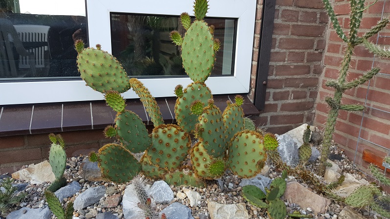 Mate: de begin opzet als lange strook met cactussen en yucca's door elkaar is helaas mislukt/gewijzigd. Heb nu een bult stenen tegen de gevel met een mengsel van potgrond, klei, zand en grind ertussen waar de cactussen met zn allen in staan te bakken op het zuiden. Van de yucca's het 1 en ander verloren in de loop der jaren helaas. Dit jaar weer vanuit het niets 2 uitvallers die het 3 jaar prima leken te doen :?