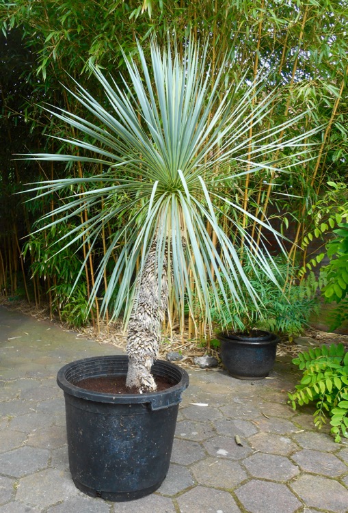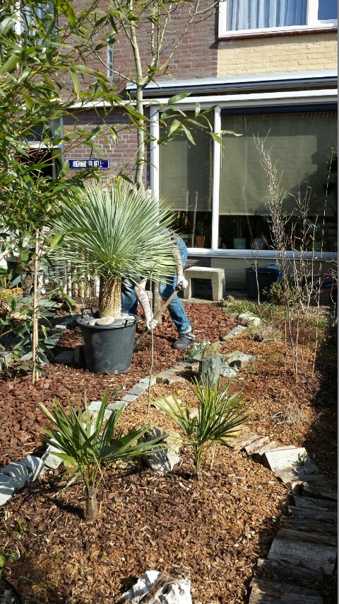 Ingraven met kuip kan ook prima met het voordeel dat onder extreme omstandigheden de plant alsnog naar binnen kan. Wel bijtijds opdelven want bij -10° lukt dat niet meer. Een handiger methode is om eerst een overmaatse kuip in te graven en daar de kuip met de Yucca in te zetten. Hier staat Yucca rostrata al sinds 2012 in de tuin nadat in de winter van dat jaar de kuipplant geen krimp gaf na -19°C. De Yucca staat hier op een regenluwe plek. Omdat je er door bomen het bos niet meer ziet en de plant steeds meer verscholen raakt, heb ik een nieuw exemplaar aangeschaft die ik als kuipplant wil aanhouden. Volgens Thomas Boeuf in Yucca & Co zijn de meeste Yucca sp. tevreden met een bescheiden maat kuip zolang deze genoeg stabiliteit biedt (eventueel verzwaren met keien) en is verpotten zelden nodig. Voordeel hierbij is dat de kluiten snel opdrogen wat gunstig is voor de vorstbestendigheid.