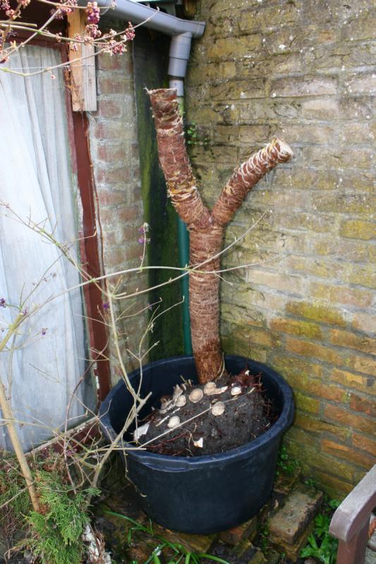 Door het gewicht van alle bladeren (die er nooit af gehaald zijn) en de stam is hij omgevallen en daarna flink doorgegroeid.