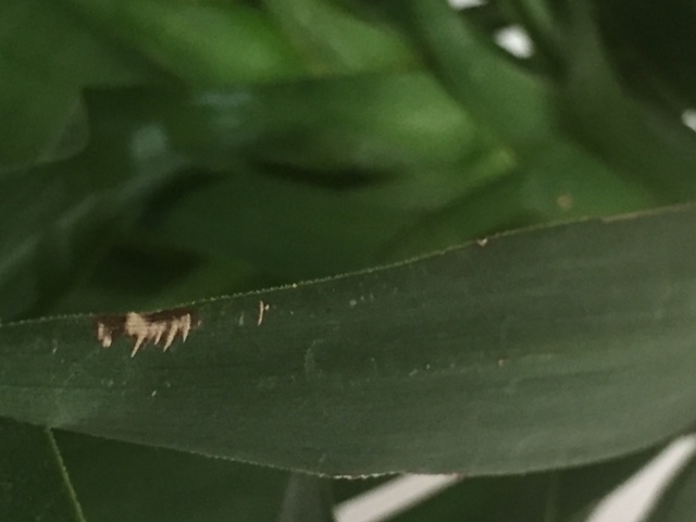 Er is ook niets wat de bladeren geraakt heeft. De plant staat in hoek en niet in gedeelte waar ik veel langsloop.
