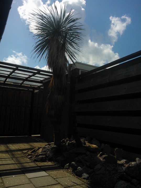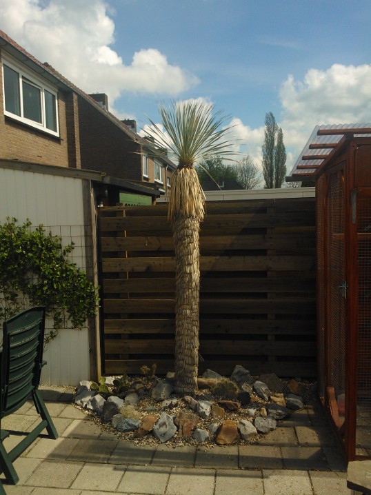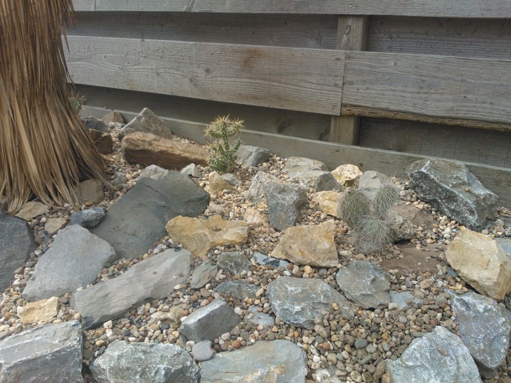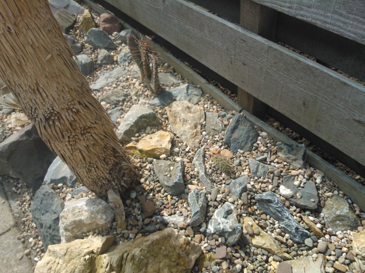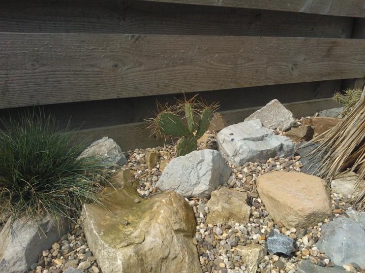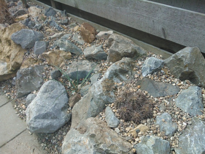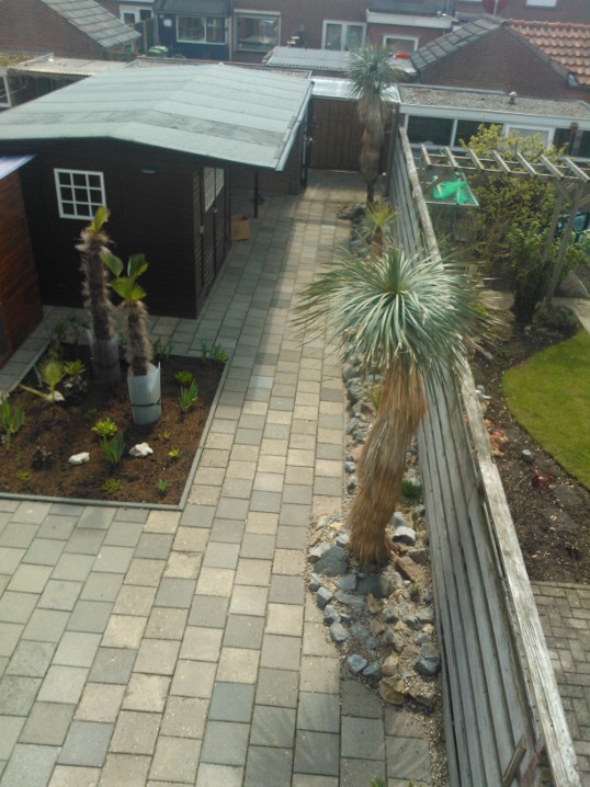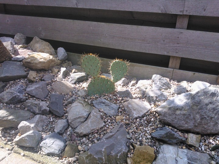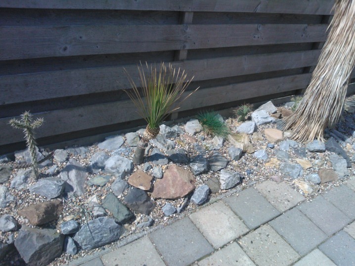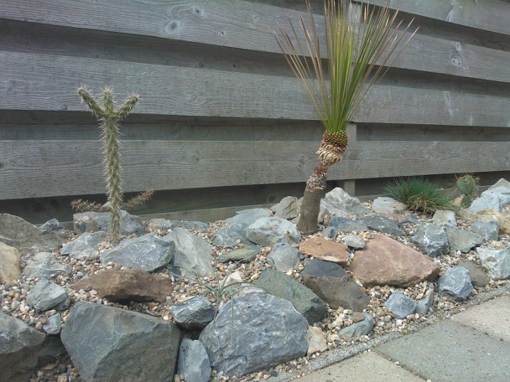 De strook is ongeveer een meter of 10 lang waarvan de helft mijn drainage bak is van de hele tuin. Dit is ruim een meter diep uitgegraven met onderin gaten geboord tot in het zand. Deze "bak" voorzien van een tractorband in delen op de kop erin als luchtkamer en verder grind en rotsblokken toegevoegd. Hier watert mn schuurtje op af, die van de woningbouw, schuur buurman en overtollige water van de tegels stroomt erin. Bak draineert als een malle zodoende hierbovenop de cactussen en yucca's geplaatst. De strook bestaat alleen uit rotsblokken en de ruimtes ertussen opgevuld met 4/16 grind waardoor het een luchtig geheel is, de planten staan tevens op het zuiden waardoor zo tot 1500 volle bak zon hebben.