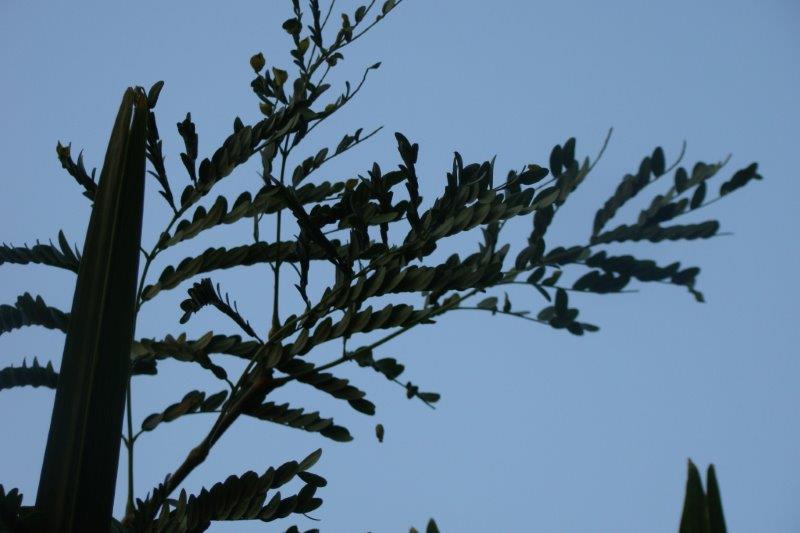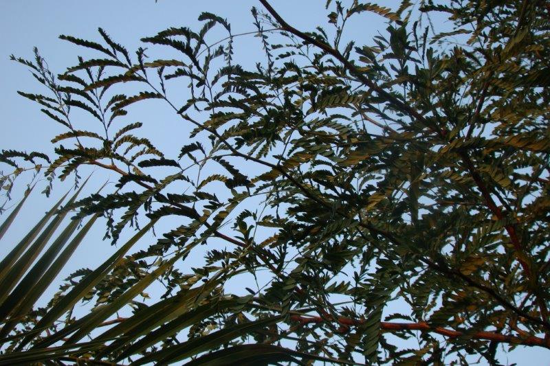 Vorig jaar had iemand de opmerking gemaakt dat de boom een Gleditsia zou kunnen zijn, omdat het blad daar sterk op lijkt. Ik heb ook een gleditsia staan in onze tuin. In het voorjaar heb ik beide bomen in het oog gehouden, en ze gingen elk op een andere wijze aan de groei. Enkele dagen geleden kreeg ik de opmerking opnieuw als zou de boom een gleditsia zijn. Gisterenavond heb ik dan van beide bomen een foto gemaakt. Van de albizia kalkora gingen de blaadjes toe, van de gleditsia niet.