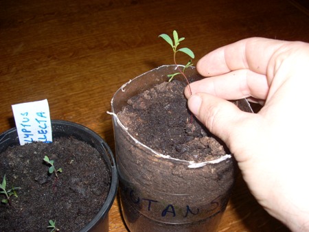 Heb even geen nieuwe foto's, maar er zit nog niet zoveel verschil in wat de groei betreft,een soort schijnt wat sneller te groeien,heb ze nu appart in potten overgezet, en heb zelfs doorgzaagde pet-flessen gebruikt voor over te planten.Ik moet alleen de wortelgroei in de gaten houden, volgens mij gaan de wortels van de eucalyptus de breedte in, dus dit mag niet te smal worden, maar voorlopig kunnen ze even vooruit,verder staan ze nu op zolder voor een raam.