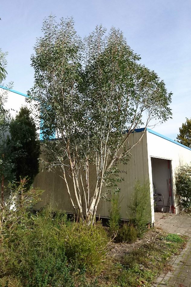 Deze staat in mijn tuin in Midden-Limburg. Hij is in mei 2 jaar geleden teruggezet op 2,5 meter. Nu weer zo'n 5 meter hoog. Eucalyptus pauciflora ssp. debeuzevillei.