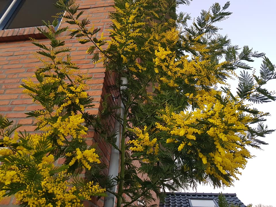 Vorig jaar om deze tijd heb ik een Acacia gekocht bij Intratuin. Het was een klein struikje maar ik wilde er een boompje van maken dus heb ik de meeste zijtakken weg geknipt. Onze in Portugal wonende Palmvriend schreef al eens over de buitengewone groeikracht van deze Acaciasoort en hij heeft niet overdreven. Nu is hij meer dan twee meter hoog en bloeit uitbundig.