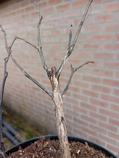 Hier staat Lagerstroemia al jaren in de tuin. De eerste ging in februari 2012 verloren, dat was niet de enige onvolkomen wintervaste soort die sneefde. Ze bloeien hier zelden, misschien is de kleigrond te zwaar. Het donkerrode blad van de cv. 'Best Red' is op zichzelf al een aanwinst in een tuin waarin bladkleur en vorm de voorkeur genieten. Een tweetal kleine planten die ik het najaar verwierf en in de kas deed overwinteren, ontwikkelden schimmel door de hoge luchtvochtigheid en staande lucht.