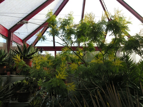Om alvast in voorjaarsstemming te komen, Acacia dealbata 'Gaulois Astier' in de kas staat op 't punt van bloeien. Om ervan te kunnen genieten zou ik de plant eigenlijk in huis moeten halen. Een Acaciasoort welke later in bloei komt zou mooi zijn maar welke? Acacia armata bloeit later weet ik uit ervaring, maar meerdere pogingen om deze soort in de collectie te herintroduceren, mislukten.