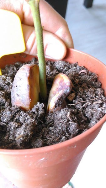 Tja... Deze heeft zijn tijd al gehad denk ik. De ene helft van de pit is aan het wegrotten, de andere helft heeft scheurtjes en de nieuwe scheutjes lijken geen leven meer in zich te hebben...