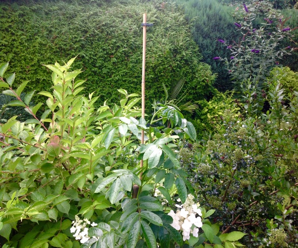 Hij is nu op stam gebracht en groeit nog door tot voorbij de 2.50 M. Ondanks de koude en de natheid bloeit ie nog volop.