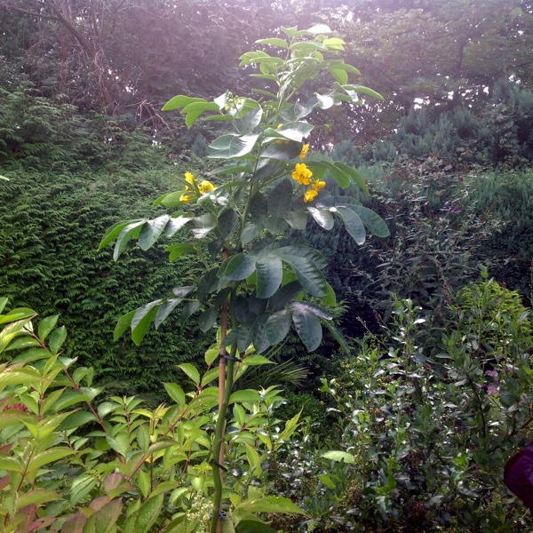 Ik heb deze fraaie plant met dank aan GHP opnieuw aan mijn collectie mogen toevoegen. De plant groeit energiek en heeft onlangs de 2 m gehaald. De vegetatieve groei is nu gestopt en komen bloemen aan. Ik kende deze heester ook als Cassia floribunda. Het is een kruising die naar het genus Senna is verhuisd, i.e. Senna x floribunda (S. multiglandulosa x S. septemtrionalis, syn. Cassia corymbosa var. plurijuga). De plant is waarschijnlijk matig winterhard. S. corymbosa en S. multiglandularis staan vermeld als zone 8 soorten (zones 8-12). Senna corymbosa waarvoor de RHS een minimumtemperatuur van -5 °C aangeeft, groeit in Cornwall.