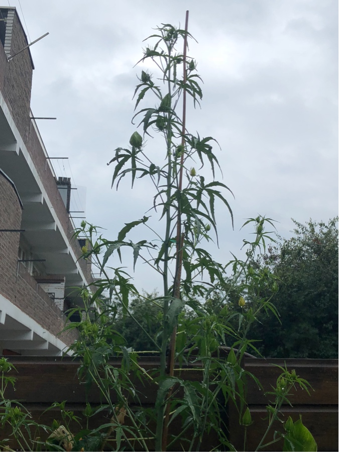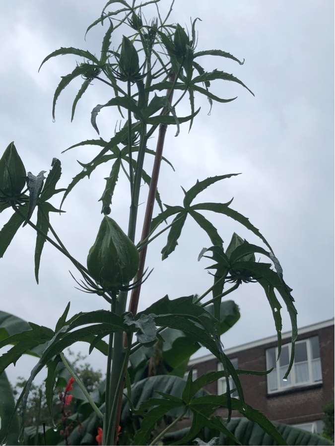 In het voorjaar heb ik een hibiscus coccineus gekocht met een heel mooi hennep achtig blad :). Intussen is hij al bijna 3,5 meter hoog en hij staat vrij zonnig en zuinig met water ben ik niet. Plant staat in volle grond.