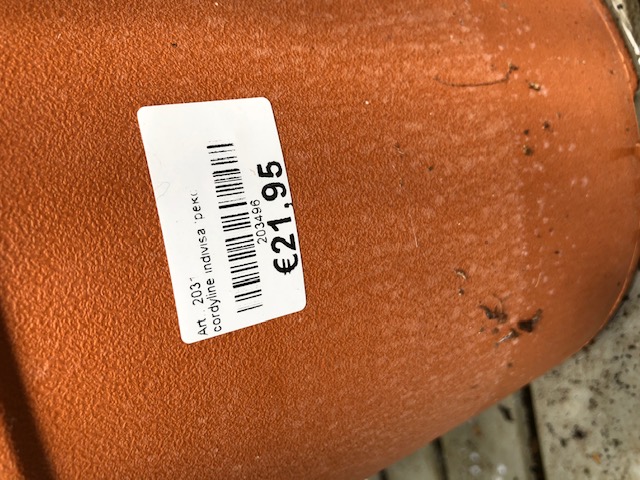 Dit is een Cordyline australis variegata. Deze bontbladige varieteit wordt meestal als 'Torbay Dazzler' verkocht maar soms ook als 'Albertii'. Cordyline indivisa heeft breder groen blad met oranjekleurige nerven. Deze geldt als notoir lastig om te houden en wordt nauwelijks nog aangeboden. Ik heb de indivisa meermaals gehad maar ze gingen nooit langer mee dan een paar jaar. Cordyline australis 'Torbay Dazzler' is een sterke variëteit die op den duur een mooie stam ontwikkelt. De koolpalm verdraagt een paar graden vorst maar heeft daarbij een hekel aan natte voeten waardoor de wortels op de kop kunnen gaan rotten. Hier staan ze in de winter droog onder het dakoverstek en gaan alleen tijdelijk de kas in vanaf ± -3°C. Als ze te lang binnen staan gaan de bladeren rekken en vermindert de windweerstand met geknakte bladeren tot gevolg. Cordylines hoeven niet vaak te worden verkuipt en een bescheiden potmaat is genoeg. Immers de omvang van de kroon blijft ondanks de groeiende stam vrijwel constant. Water en af en toe wat mest in het groeiseizoen zijn goed voor een constante groei. Een bescheiden kuipmaat heeft als voordeel dat in het najaar de potgrond sneller opdroogt.
