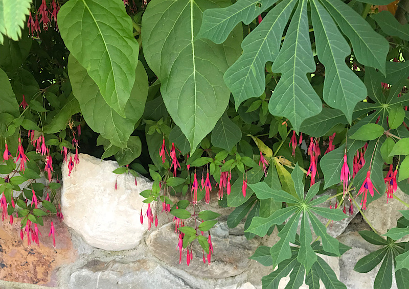Ik heb een manihot in volle grond staan sinds vorig jaar. Hij was vorig jaar een meter hoog en de stam een duim dik. Ik had hem ingepakt met fleecedoek. Na 5 dagen -10 liep de stam niet meer uit. Maar de basis liep in het voorjaar weer uit. Hij is nu weer een meter hoog. De 20-30 cm sneeuw kan ook geholpen hebben. Hij staat daarnaast in een enorme bloembak/border van 50 cm hoog. Dus geen natte voeten in de winter. De foto is van juni/juli dit jaar. Ik heb ook een brassaiopsis staan in de volle grond. Maar dit wordt de eerste winter. Feijoa sellowiana heb ik sinds vorig jaar ook staan in diezelfde verhoogde bloembak. De toppen waren op sommige plekken iets ingevroren. Bloemen heb ik nog niet gezien.