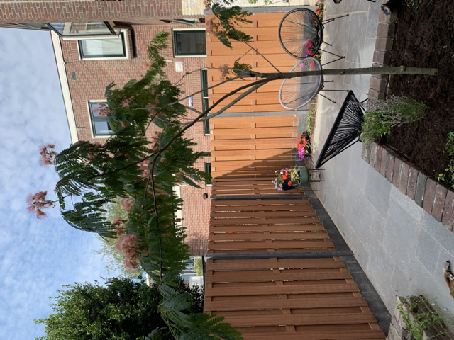 In onze tuin hebben we sinds kort een mooie [img]Perzische slaapboom ( Albizia julibrissin )staan. De hoogt is nu 120 cm en een dikte van 10 cm. We zijn er erg blij mee met dit pareltje.
