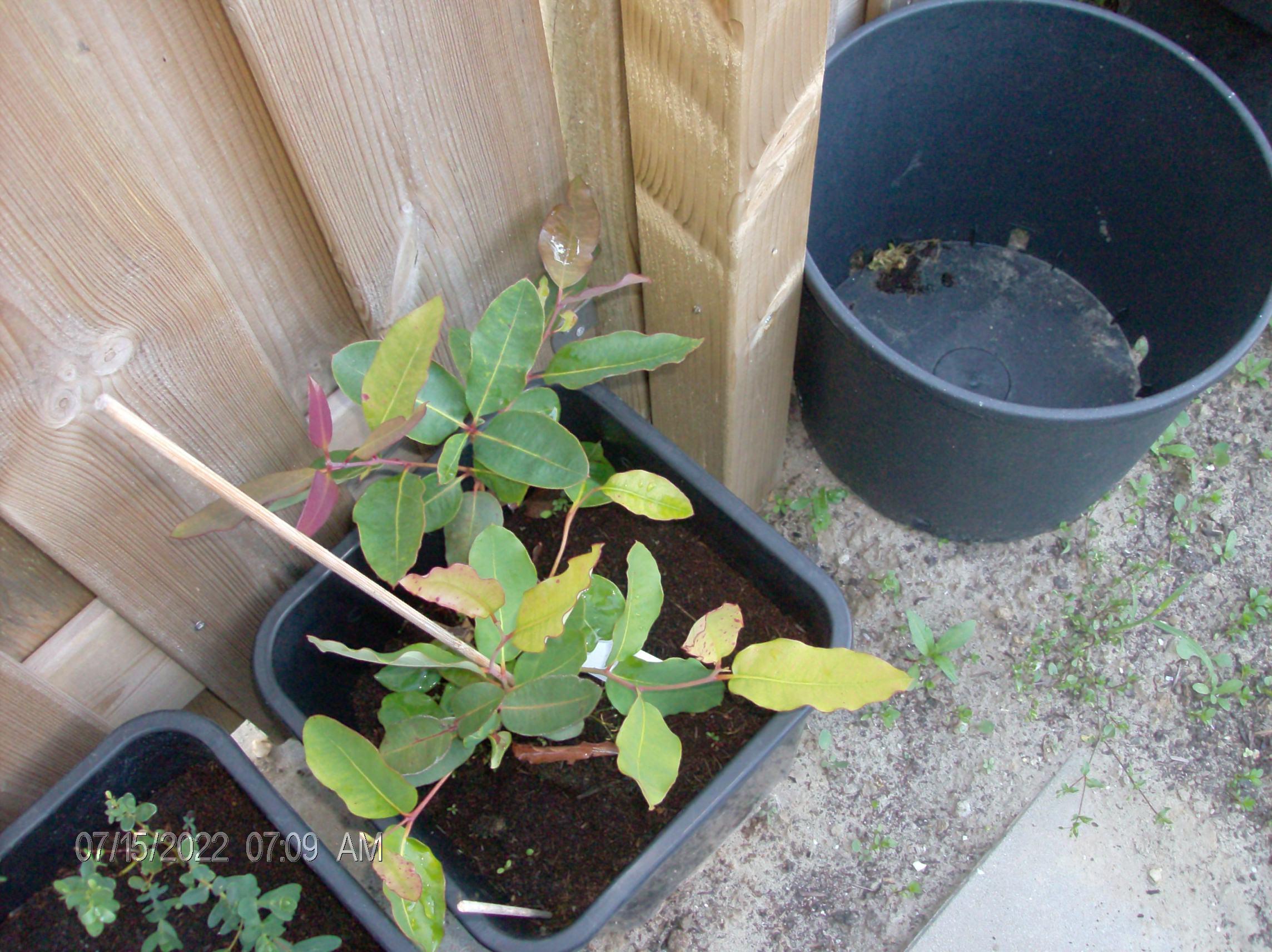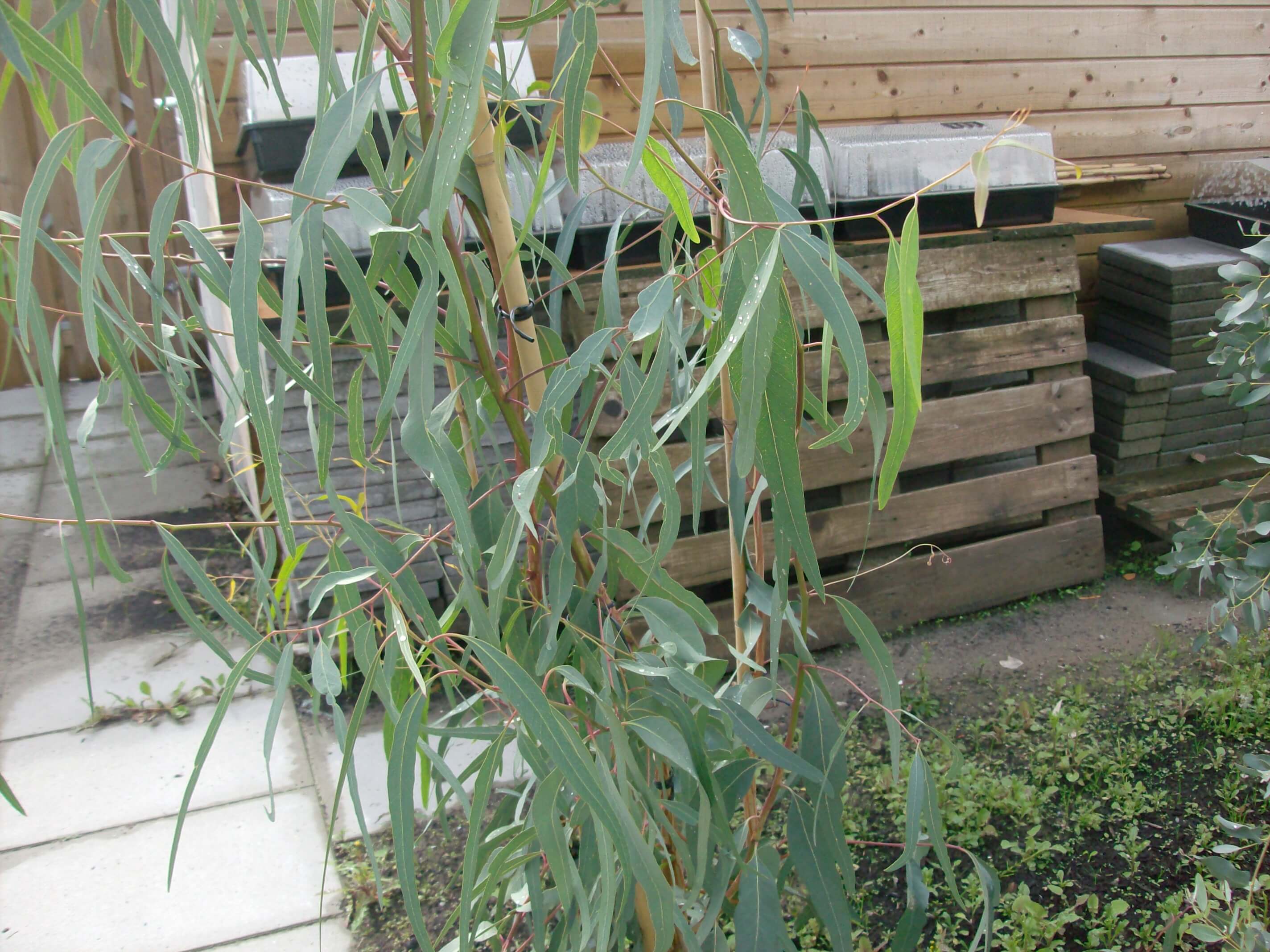Eucalyptus camaldulensis; eerste jaar in een grote kuip (90 liter) gehouden en enigszins beschut neergezet. Vorige zomer is hij 2,5 meter gegroeid! Afgelopen winter is het ook goed gegaan. Inmiddels heb ik ze gesnoeid en verplaatst naar de volle grond. Het duurde even voor de groei weer op gang kwam, maar inmiddels groeit hij weer lekker.