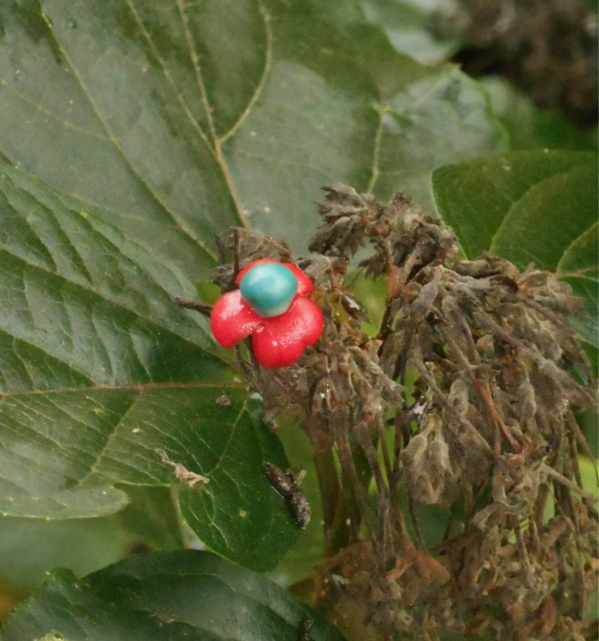 Clerodendrum bungei heeft dit seizoen 1 vrucht gevormd. Dat is in mijn optiek een zeldzaam verschijnsel. Heb het althans nog niet eerder gezien. Grappig dat de vrucht sprekend lijkt op de vrucht van Clerodendrum trichotomum met een blauwe bes omgeven door een rode krans van kelkbladeren. Bij de laatste is vruchtvorming normaal met kiemkrachtige zaden.
