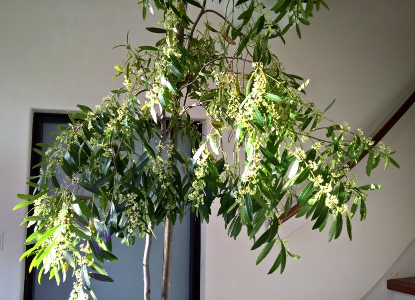 De Qat boompjes staan in de hal, samen met wat andere koukleumen. Zouden ze geuren dan zou ik dat wel ruiken, maar ik ruik niets. Voor alle zekerheid heb ik mijn neus tussen de bloemen gestopt en dan ruik je wel een lichte geur, maar niet echt iets speciaals of aantrekkelijks.