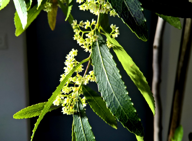 Een aantal jaren geleden heb ik eens wat Catha edulis zaden gezaaid en uiteindelijk zijn daar twee boompjes van overgebleven. Tot vorig jaar stonden ze in de winter in de kas die met een elektrische kachel vorstvrij werd gehouden. Inmiddels zijn de energieprijzen bijna verviervoudigd zodat ik de vorstgevoelige planten waaronder de Qat maar in huis gehaald heb.