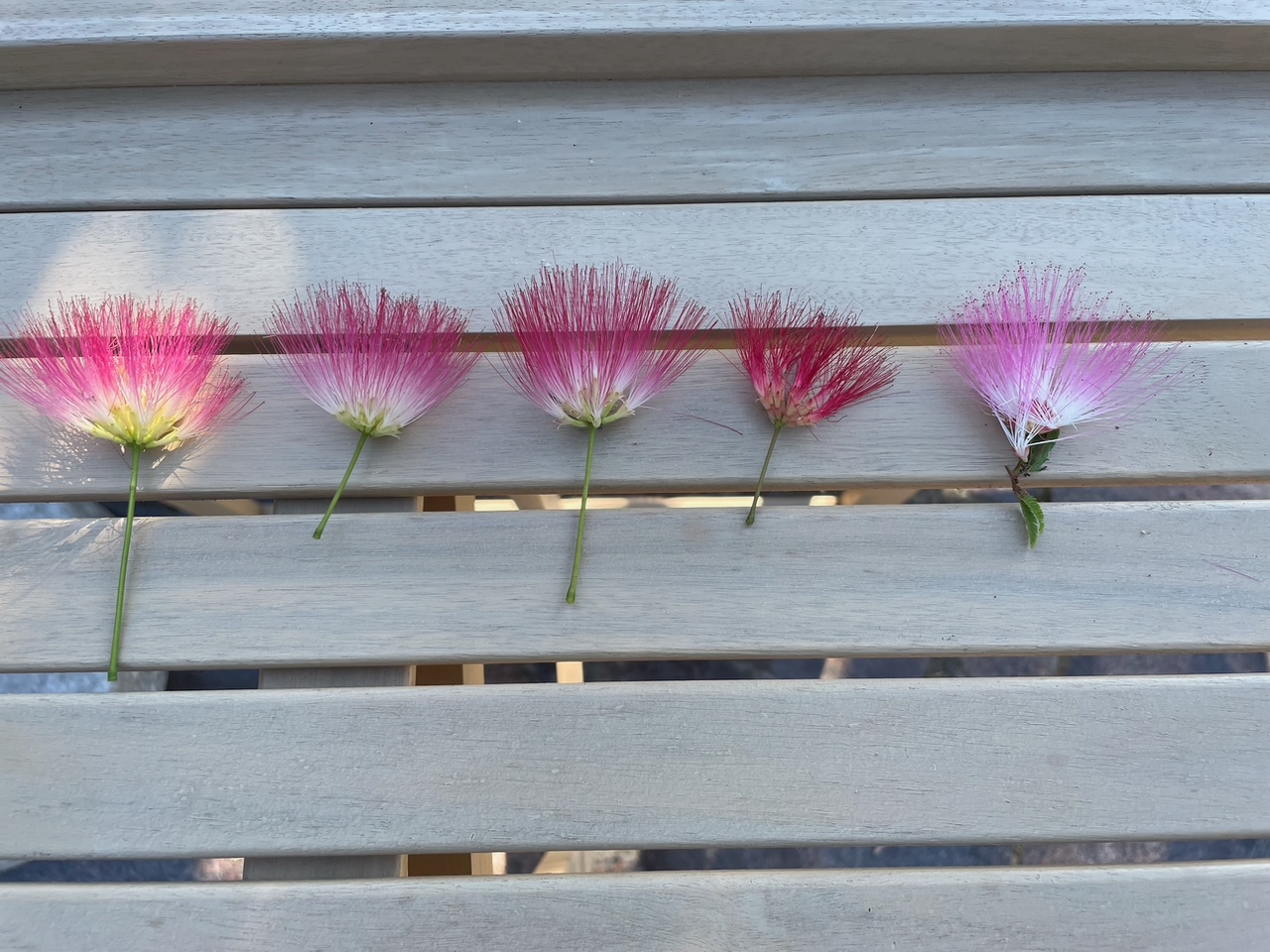 Van links naar rechts: 1) de gewone Albizia Julibrissin, 2) Albizia J. Ombrella, 3) Albizia J. Rouge De Tuilière, 4) Albizia J. Evi's Purple, 5) Calliandra Surinamiensis.