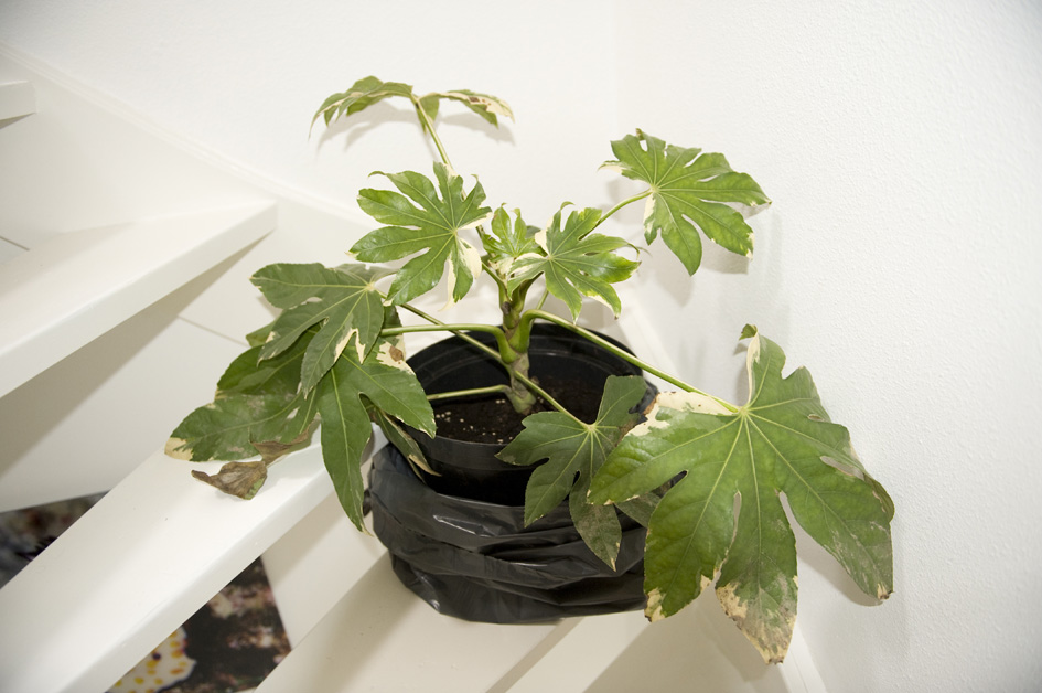 Hij is al afgehard, heeft de hele winter in pot buiten gestaan, ik hou hem nu nog even binnen zodat ie door kan groeien, ik wil hem uiteindelijk gaan stekken. Ik was benieuwd wie fatsia's in de tuin heeft staan (ik heb er aardig wat, maar allemaal groene) en dan vooral de bonte variant.