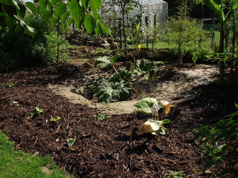 In dat lager gelegen punt , waar de Gunnera ging komen heb ik een put gemaakt van 1m diep en 1,5m diameter, en deze is volledig gevuld met koemest.