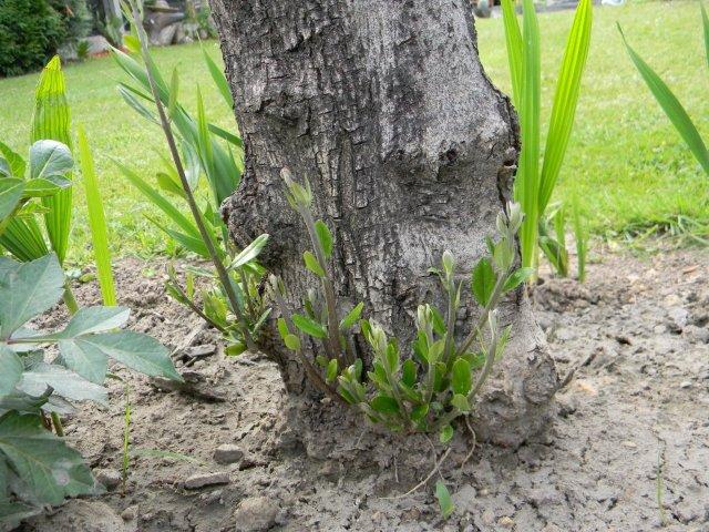Best dat je de nieuwe scheuten onderaan de stam volledig wegneemt anders blijft er geen energie over om de bladeren boven te hernieuwen.